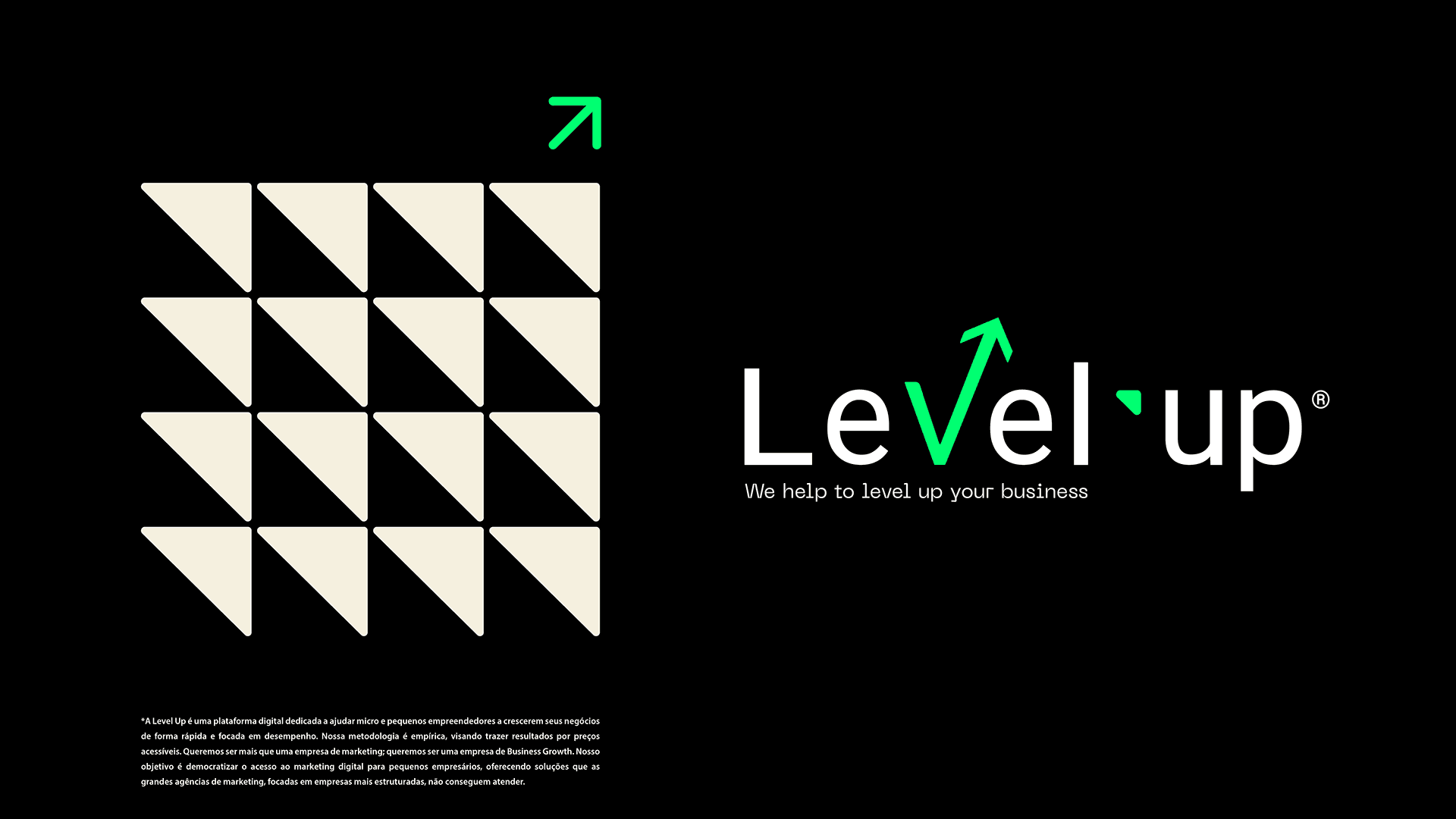A Level Up é uma plataforma digital dedicada a ajudar micro e pequenos empreendedores a crescerem seus negócios de forma rápida e focada em desempenho. Conta com uma metodologia é empírica, visando trazer resultados por preços acessíveis. Através do Business Growth, seu objetivo é democratizar o acesso ao marketing digital para pequenos empresários.